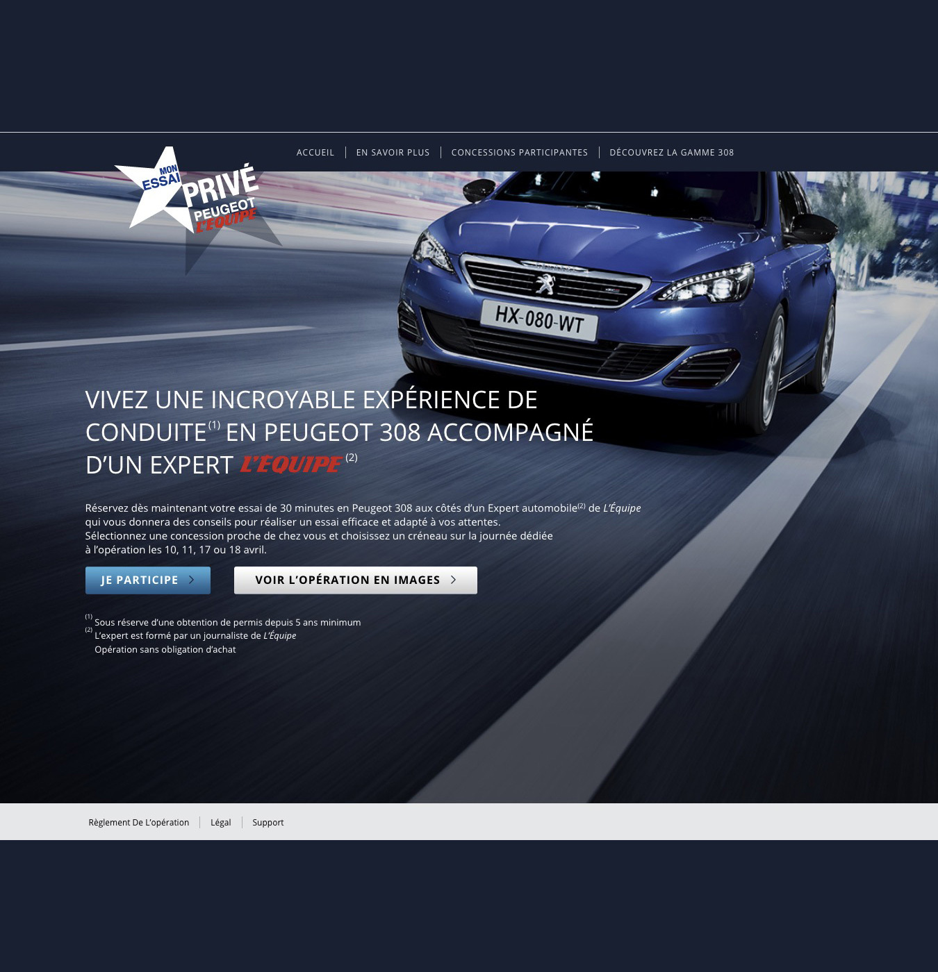 The purpose of this site was to have the general public "actively" participate in testing the new Peugeot 308 accompanied by a sports journalist from the newspaper l'Equipe at Peugeot dealerships in France.